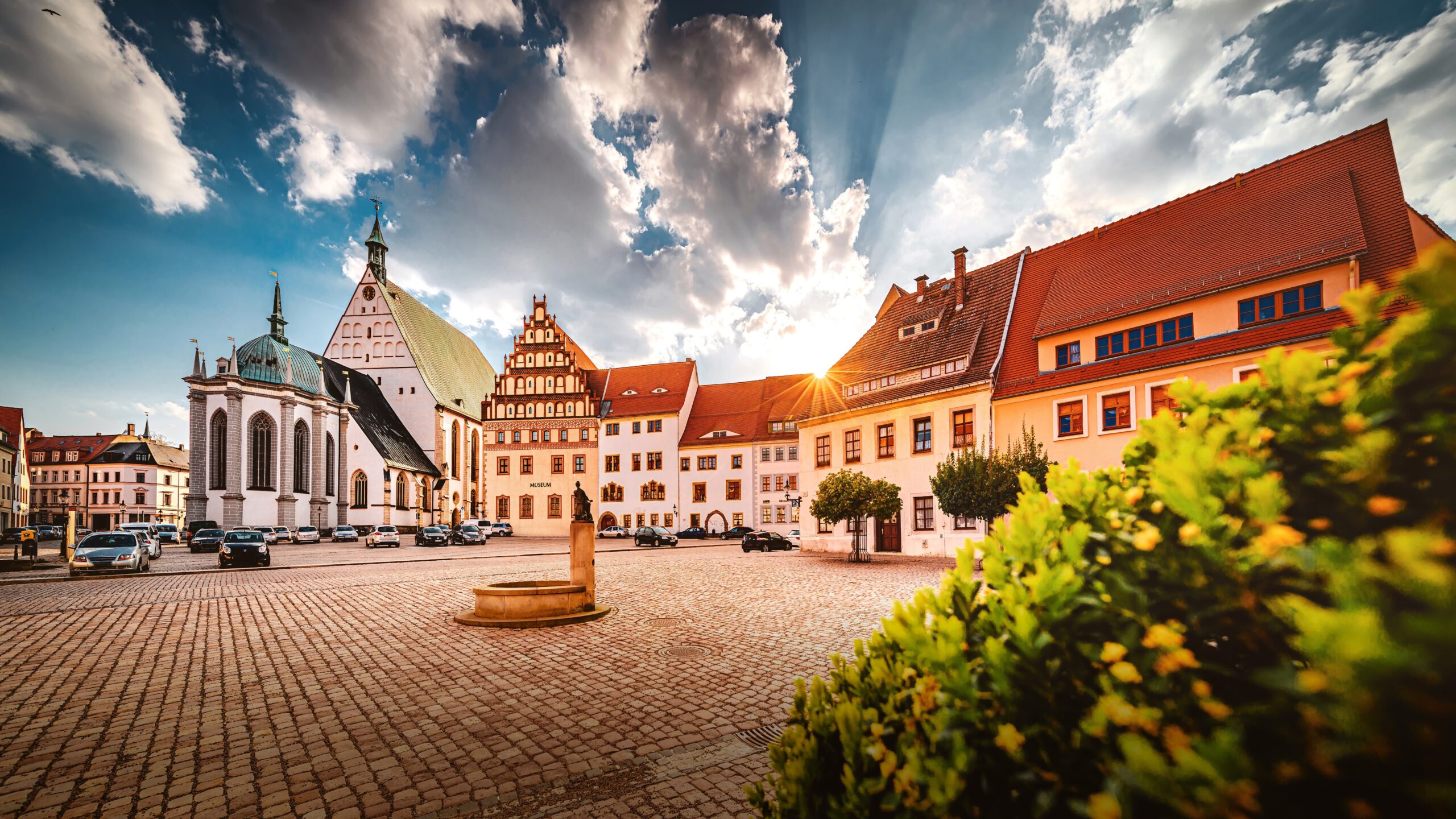 Motiv: Der malerische Freiberger Untermarkt bei Sonnenuntergang